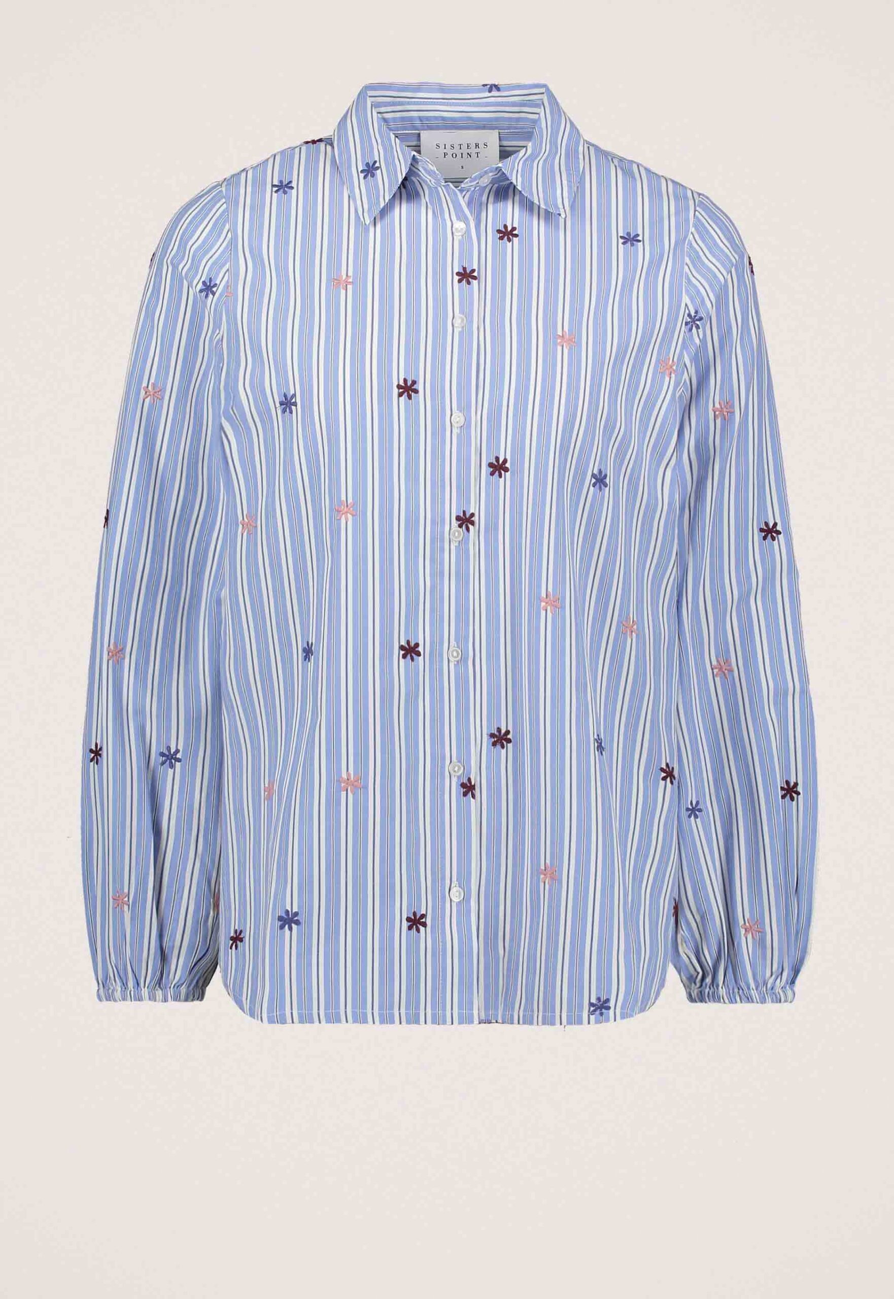 Dit is de 19152 Istea Blouse van het merk Sisters Point. Deze gestreepte blouse heeft een all-over print van geborduurde bloemen. De blouse heeft een afgeronde onderkant met splitten aan de zijkant. De mouwen zijn afgewerkt met elastische boorden.