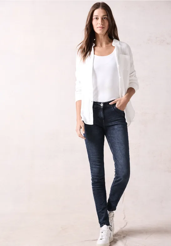Deze slim fit jeans van CECIL voor dames heeft een hoge taille en skinny pijpen. De knoop- en ritssluiting en 5-pocketstijl zorgen voor een klassieke look. De katoenmix met stretch maakt deze jeans in de Vicky-stijl bijzonder comfortabel.