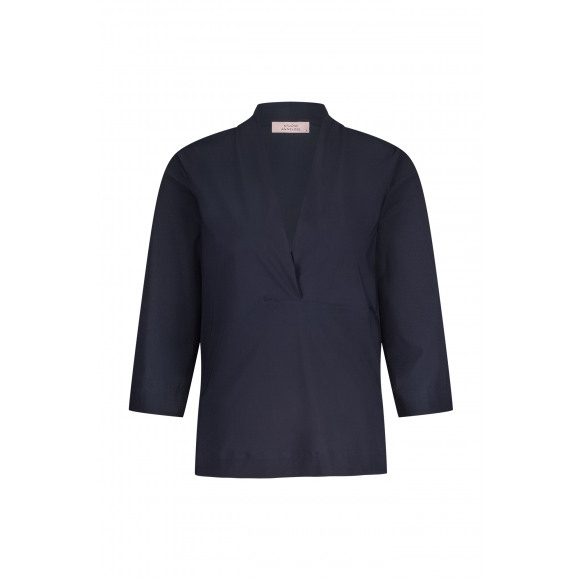 Top van het merk Studio Anneloes. Deze donkerblauwe top heeft een opstaande kraag, V-hals en driekwart mouwen. Dankzij de horizontale naad ontstaat er een subtiel plooidetail dat het model een luchtige uitstraling geeft. Het materiaal is kreukvrij en voelt comfortabel aan.