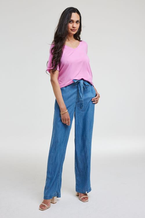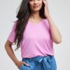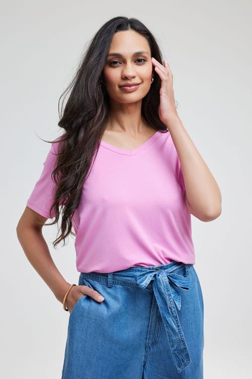 T-shirt Daily Fuchsia Pink: Jouw Nieuwe Favoriet Dit T-shirt Daily Fuchsia Pink is de perfecte aanvulling op je garderobe. De levendige roze kleur brengt een frisse, vrolijke touch in je dagelijkse outfit. Het shirt is ontworpen in een regular fit die recht valt, waardoor het comfortabel en veelzijdig is. De korte mouwen en de elegante V-hals maken het een ideaal kledingstuk voor elke dag. Stel je voor dat je op een zonnige dag dit luchtige T-shirt draagt; het maakt je look compleet zonder al te veel moeite. Gemaakt van hoogwaardige stof Gemaakt van 95% viscose en 5% elasthan, biedt dit T-shirt je de perfecte combinatie van comfort en stijl. Viscose, bekend om zijn gladde en zachte textuur, zorgt ervoor dat het shirt heerlijk aanvoelt op je huid. Het beetje elasthan in de stof geeft precies genoeg stretch, zodat je moeiteloos kan bewegen en de perfecte pasvorm behoudt. Stijladvies Wil je een casual maar stijlvolle look creëren? Combineer dit T-shirt Daily Fuchsia Pink met een mooie jeans. De frisse roze tint werkt uitstekend samen met denim, waardoor je outfit een speelse en moderne uitstraling krijgt. Dit is een veelzijdig kledingstuk dat je gemakkelijk kunt combineren met andere items in je kast. Wasvoorschrift Wassen: Om het T-shirt zo lang mogelijk fris en mooi te houden, was je het op 30 graden. Droogvoorschrift: Laat het aan de lucht drogen en vermijd de droger om de stof en kleur te beschermen. Strijkvoorschrift: Strijk het op een lage temperatuur om de gladde textuur van de viscose te behouden en kreukels te verwijderen. Vermijd andere behandelingen zoals bleken en chemisch reinigen om de stof en kleur te behouden. Met dit handige T-shirt Daily Fuchsia Pink ben je verzekerd van een kledingstuk dat je steeds opnieuw wilt dragen. Voeg het toe aan je collectie en ervaar de veelzijdigheid en het comfort zelf.