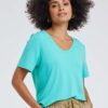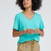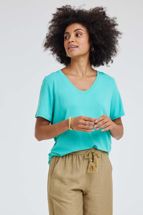 T-shirt Daily Pool green: Jouw dagelijkse frisheid Het T-shirt Daily Pool green is de ideale toevoeging aan je garderobe, met zijn verfrissende groene kleur en moderne ontwerp. Dit T-shirt heeft korte mouwen en een recht model, waardoor het een comfortabele en stijlvolle keuze is voor elke dag. De subtiele V-hals voegt een vleugje elegantie toe, perfect voor een casual, maar toch modieuze uitstraling. Gemaakt van hoogwaardige stof Dit T-shirt is vervaardigd uit een hoogwaardige mix van 95% viscose en 5% elasthan. Deze samenstelling geeft het shirt een soepele, zachte touch en een lichte elasticiteit voor extra draagcomfort. Het materiaal ademt, wat zorgt voor een luchtig gevoel, ideaal voor warme dagen en frisse momenten. Stijladvies Heerlijk veelzijdig en eenvoudig te combineren met je favoriete kledingstukken. Combineer het met een mooie jeans voor een tijdloze look, of draag het over een rok voor een meer speelse stijl. Voeg accessoires toe om je outfit een persoonlijke twist te geven. Wasvoorschrift Wassen: Om de kwaliteit van het T-shirt te behouden, was het op een temperatuur van 30 graden. Droogvoorschrift: Het is aan te raden om het kledingstuk niet in de droger te plaatsen. Laat het liggend drogen voor het beste resultaat. Strijkvoorschrift: Strijk het op een lage temperatuur om het soepel te houden en kreukels te vermijden. Het T-shirt Daily Pool green biedt je de perfecte balans tussen comfort en stijl, een onmisbaar item voor elke garderobe!