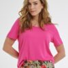 T-shirt Fame Fuchsia: Jouw Nieuwe Favoriet Stap in de wereld van comfort en stijl met het T-shirt Fame Fuchsia. Dit unieke kledingstuk combineert het beste van eenvoud en klasse. Met zijn heldere roze kleur en ronde hals zorgt dit T-shirt voor een frisse en vrolijke uitstraling. Het ontwerp met korte mouwen en een regular fit pasvorm maakt het perfect voor elke dag, ongeacht het seizoen. Ideaal voor die momenten dat je licht en luchtig gekleed wilt zijn. Gemaakt van hoogwaardige stof Dit T-shirt is vervaardigd van een luxueuze mix van 95% viscose en 5% elasthaan. Deze combinatie biedt niet alleen een superieure zachtheid, maar ook een subtiele stretch die zorgt voor extra draagcomfort. Viscose staat bekend om zijn ademende eigenschappen, terwijl elasthaan de flexibiliteit verhoogt, waardoor je de hele dag door kunt bewegen zonder beperkingen. Stijladvies Dit veelzijdige T-shirt leent zich perfect voor talloze stylingopties. Of je nu gaat voor een casual look of iets meer gekleed wilt verschijnen, het T-shirt Fame Fuchsia past overal bij. Combineer het met een mooie jeans voor een tijdloze outfit die altijd goed is. Voeg een statement ketting toe en je bent klaar voor een avondje uit! Wasvoorschrift Wasvoorschrift: Om je T-shirt in topconditie te houden, was je het op 30 graden. Vermijd bleken en chemisch reinigen voor het behoud van de kleur en vorm. Droogvoorschrift: Droog het T-shirt niet in de droger. Laat het liggend drogen om ongewenste vervorming te voorkomen. Strijkvoorschrift: Strijk het T-shirt op lage temperatuur voor het beste resultaat, zonder de stof te beschadigen. Met het T-shirt Fame Fuchsia investeer je in een veelzijdig en comfortabel kledingstuk dat niet mag ontbreken in je collectie. Voeg dit prachtige T-shirt vandaag nog toe aan je garderobe!