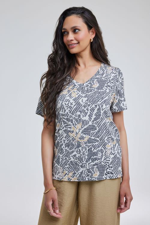 Stijlvol Comfort: T-shirt Pixel Offwhite Bereid je voor om elk moment van de dag fris en vol zelfvertrouwen te beleven met het T-shirt Pixel Offwhite. Dit korte mouw T-shirt, met zijn recht model en speelse print, is ontworpen om je een gevoel van vrijheid en stijl te bieden. De V-hals geeft je een elegante uitstraling, terwijl de lichte en luchtige stof ideaal is voor warmere dagen. Gemaakt van Hoogwaardige Stof Dit T-shirt is vervaardigd uit een hoogwaardige mix van 95% viscose en 5% elasthan. Visose biedt een heerlijk zacht en ademend gevoel, zodat je comfortabel blijft, zelfs op de zonnigste dagen. De toevoeging van elasthan zorgt voor net dat beetje extra stretch, zodat het kledingstuk altijd mooi in model blijft. Stijladvies Haal het meeste uit je look door het T-shirt Pixel Offwhite te combineren met een mooie jeans. De veelzijdige stijl en neutrale kleur maken het eenvoudig om dit T-shirt te matchen met verschillende tinten en texturen, zodat je altijd in stijl voor de dag komt. Wasvoorschrift Wassen: Om de kwaliteit van je T-shirt te behouden, was je het op 30 graden. Droogvoorschrift: Het is belangrijk om het T-shirt niet in de droger te doen. Laat het bij voorkeur aan de lucht drogen voor de beste resultaten. Strijkvoorschrift: Strijk het op een lage temperatuur om de stof glad en netjes te houden. Met deze eenvoudige onderhoudsinstructies blijft je T-shirt Pixel Offwhite net zo fris en stijlvol als de dag dat je het kocht. Geniet van langdurig plezier van dit veelzijdige kledingstuk!
