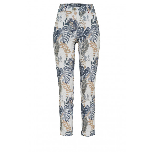 Deze zomerbroek van Toni heeft een aangesloten pasvorm en is enkelvrij. Door de kleuren van de print makkelijk te combineren met wit, zand en blauwtonen.