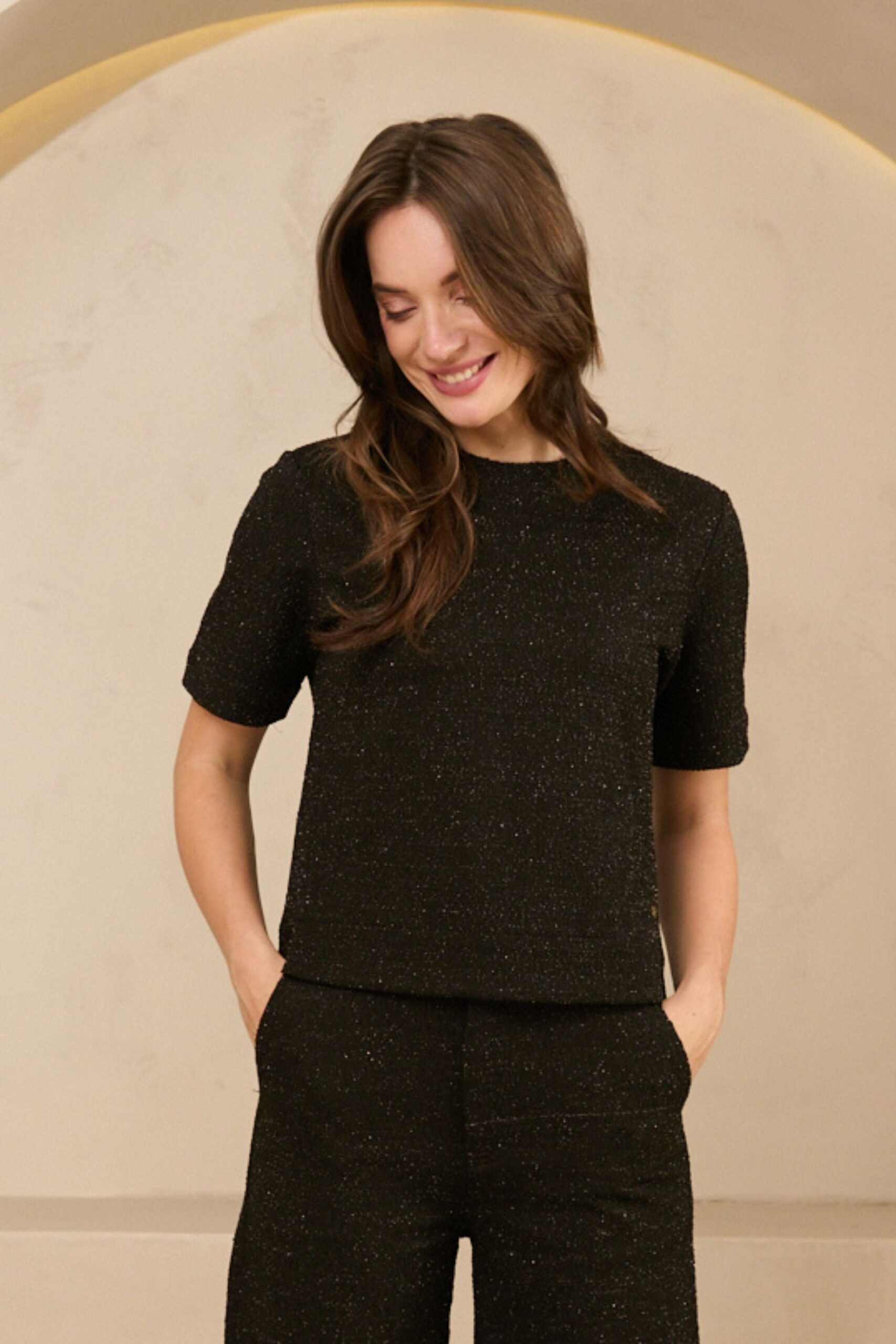 Materiaal: 90% polyester, 5% viscose en 5% elastaan Model en fit: Het model is 1.79m en draagt maat S. De maat valt normaal Lengte top: 58,5 cm bij maat S Top Eva is een zwarte top met korte mouwen en een boxy fit. De zwarte top heeft een hoge ronde hals en is gemaakt van tweed stof met een subtiele glinstering dankzij de lurexdetails. De top is qua pasvorm losvallend.