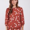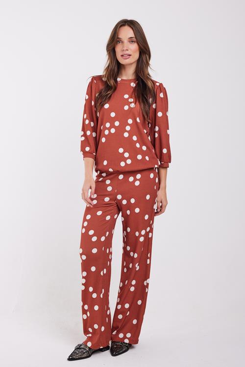 Top Fina Brown Dot Print: Stijlvol en Comfortabel Voel je op je best met de Top Fina Brown Dot Print! Dit T-shirt met een recht model en driekwart mouwen in een warme beige/bruine kleur brengt direct een vleugje speelsheid in je garderobe. De subtiele stippenprint geeft een vrolijk accent, perfect voor lange zonnige dagen. De ronde hals zorgt voor een verfijnde en tijdloze uitstraling die veelzijdig te combineren is. Gemaakt van hoogwaardige stof Deze top is vervaardigd van een duurzame mix van 99% polyester en 1% elasthaan. Deze combinatie zorgt ervoor dat de stof licht aanvoelt en tegelijkertijd een subtiele stretch biedt voor optimaal draagcomfort. Polyester is bekend om zijn slijtvastheid en behoudt zijn vorm en kleur, zelfs na vele wasbeurten. Dit maakt de top niet alleen stijlvol maar ook praktisch voor dagelijks gebruik. Stijladvies Of je nu een casual dagje hebt of een etentje plant, deze top is jouw go-to. Combineer de Top Fina Brown Dot Print moeiteloos met een mooie jeans voor een frisse look die altijd goed zit. Voeg wat leuke accessoires toe om de outfit helemaal af te maken en jij bent klaar om te stralen. Wasvoorschrift Wassen: Voor de beste zorg, was dit kledingstuk op 30 graden. Dit helpt niet alleen om de stof in topconditie te houden, maar draagt ook bij aan een duurzame garderobe. Droogvoorschrift: Zet de droger uit de dh, want dit kledingstuk voelt zich het best wanneer het natuurlijk droogt. Het behoudt zo zijn vorm en kwaliteit. Strijkvoorschrift: Als er na het drogen nog wat kreukels zijn, strijk dan op een lage temperatuur. Dit zorgt ervoor dat de stof mooi glad blijft zonder beschadigd te raken. Met de Top Fina Brown Dot Print ben je klaar voor elke gelegenheid, terwijl je geniet van comfort en stijl.
