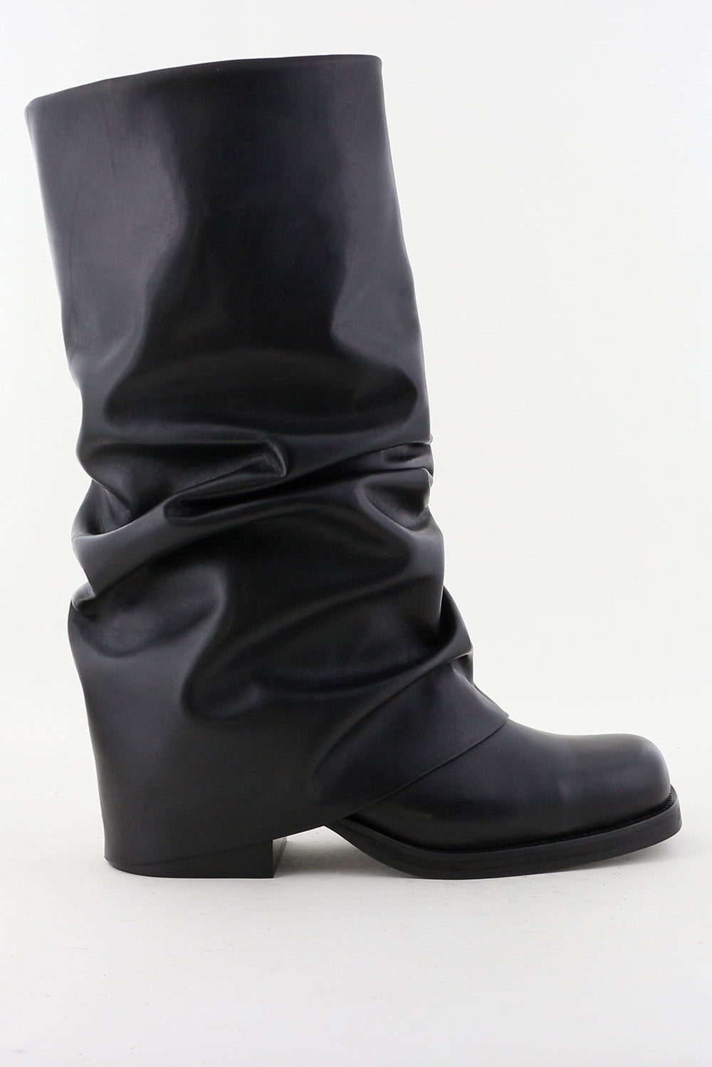 Dit zijn de laarzen TL-KORA van Toral, een zwart leren model met een brede schacht die soepel plooit en volume geeft. De stomp afgeronde neus en de stevige, vlakke zool zorgen voor een robuust profiel dat prettig draagt. Het leer voelt stevig maar soepel aan, waardoor de schacht mooi valt. De subtiele hak blijft bijna onzichtbaar en houdt de vorm rustig. Volgens het merk vallen deze laarzen normaal op maat, dus je kunt uitgaan van je gebruikelijke maat. Toral staat bekend om ontwerp met een klare lijn en materialen die mooi blijven, wat je hier direct terugziet.