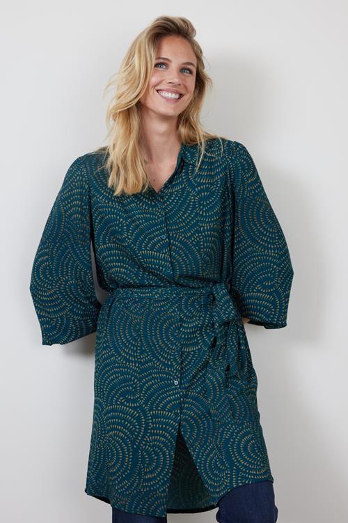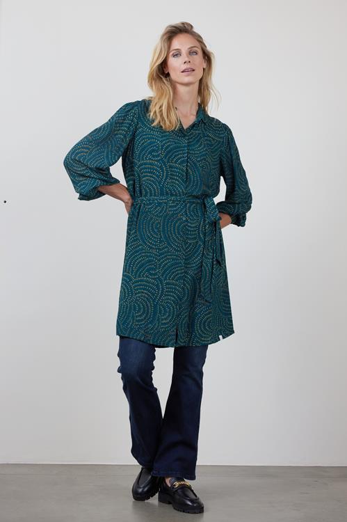 Verrijk je garderobe met de Tunic Noblesse Dark green Swirl print Stap in een wereld van elegantie met de Tunic Noblesse Dark green Swirl print. Deze tuniek combineert moeiteloos comfort met een verfijnde uitstraling. De rijke, groene kleur en de swirl print geven het item een unieke flair. Het rechte model met lange mouwen en klassieke kraag zorgt voor een tijdloze look. Dankzij de subtiele knoopsluiting is deze tuniek geschikt voor vele momenten, of je nu thuis bent of buiten de deur. Perfect voor de koudere maanden waarin je behoefte hebt aan stijl en warmte. Gemaakt van hoogwaardige stof Gemaakt van 100% viscose, voelt deze tuniek zijdezacht aan op je huid. Viscose staat bekend om zijn ademende en vochtregulerende eigenschappen, waardoor je comfortabel en fris blijft. Het lichte materiaal valt mooi en soepel, waardoor je steeds geniet van een elegante drapering. Stijladvies Combineer de Tunic Noblesse met een strakke jeans voor een casual look, of draag hem over een effen rok voor een chiquere uitstraling. De groene kleur en het unieke motief maken het combineren met verschillende accessoires en schoenen gemakkelijk. Voeg een opvallende ketting of subtiele oorbellen toe voor net dat beetje extra. Wasvoorschrift Wasvoorschrift: Was deze tuniek op een fijnwasprogramma met een maximum van 30 graden. Gebruik het liefst een mild wasmiddel om de kwaliteit van de stof te behouden. Droogvoorschrift: Hang het kledingstuk na het wassen uit om te drogen. Vermijd het gebruik van een droger om krimpen en beschadigingen te voorkomen. Strijkvoorschrift: Mocht het nodig zijn, strijk de tuniek op een lage temperatuur en bij voorkeur aan de binnenkant om de print en de stof te beschermen. Houd je look fris en stijlvol met de Tunic Noblesse Dark green Swirl print – de perfecte keuze voor de komende seizoenen.