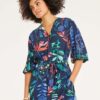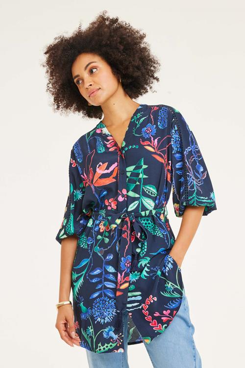 Verfrissende Elegant: Tunic Shine Botanic spice print De Tunic Shine Botanic spice print is de perfecte combinatie van comfort en stijl, ontworpen om indruk te maken. Deze tuniek heeft een prachtige blauwe kleur en een opvallende botanische print, waardoor je helemaal in de frisse en vrolijke sfeer van het seizoen komt. Het rechtvallende model met lange mouwen en een elegante V-hals zorgt voor een verfijnde uitstraling. Dankzij de knoopsluiting voeg je moeiteloos een vleugje finesse toe aan je look. Gemaakt van hoogwaardige stof Deze tuniek is vervaardigd uit 100% viscose, een materiaal dat bekend staat om zijn zachte en soepele kwaliteiten. Viscose voelt heerlijk licht aan op je huid en valt prachtig langs je lichaam, waardoor het ideaal is voor de warmere dagen. Bovendien ademt de stof uitzonderlijk goed, wat zorgt voor een optimal frisheid en comfort. Stijladvies Combineer de Tunic Shine Botanic spice print met een lichte jeans voor een casual look, of kies voor een strakke witte broek om je outfit een elegante twist te geven. Voeg enkele opvallende accessoires toe en je bent klaar voor elke gelegenheid. Met zijn veelzijdigheid en unieke print is deze tuniek een must-have in je collectie. Wasvoorschrift Wasvoorschrift: Om de pracht van je tuniek te behouden, raden we aan deze op 30 graden te wassen. Dit zorgt ervoor dat de kleuren en het materiaal in optimale staat blijven. Droogvoorschrift: Hang de tuniek op om te drogen. Vermijd de droger om krimp en beschadiging van de stof te voorkomen. Strijkvoorschrift: Strijk de tuniek op lage temperatuur om het materiaal zacht en glad te houden, zonder dat het zijn charme verliest. Met deze tuniek voeg je een tijdloos en veelzijdig stuk toe aan je garderobe. Of je nu gaat voor een casual dagje uit of een verfijnde avondlook, de Tunic Shine Botanic spice print biedt eindeloze mogelijkheden.