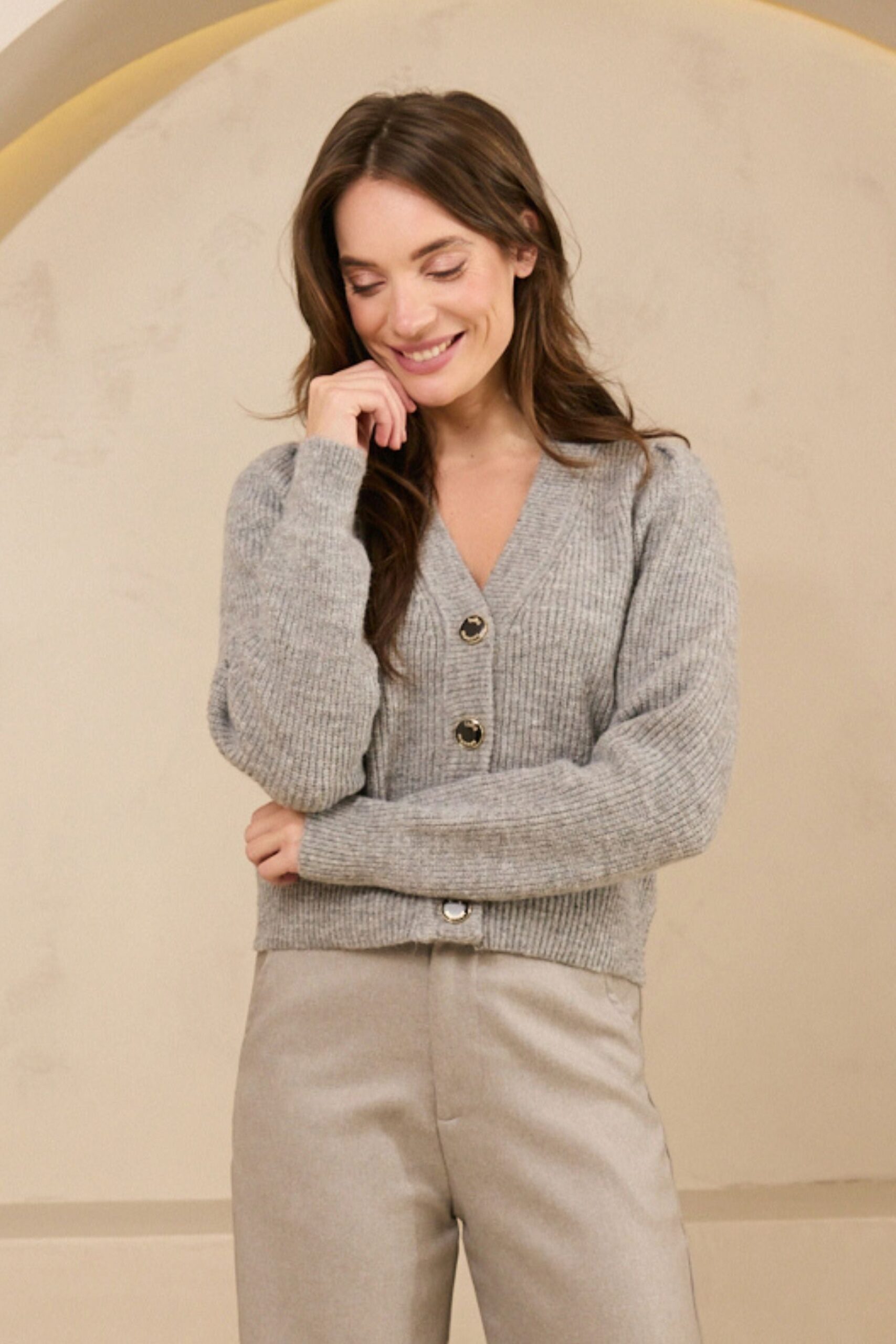 Materiaal: 54% acrylic, 18% nylon, 25% polyester, 3% elastaan Model en fit: Het model is 1.79m en draagt maat S. De maat valt normaal Lengte vest: 52 cm bij maat S Vest Lilly is een grijs gebreid vest met knoopsluiting. Het gebreide vest heeft een V-hals, subtiele pofmouwen en is qua pasvorm aangesloten.