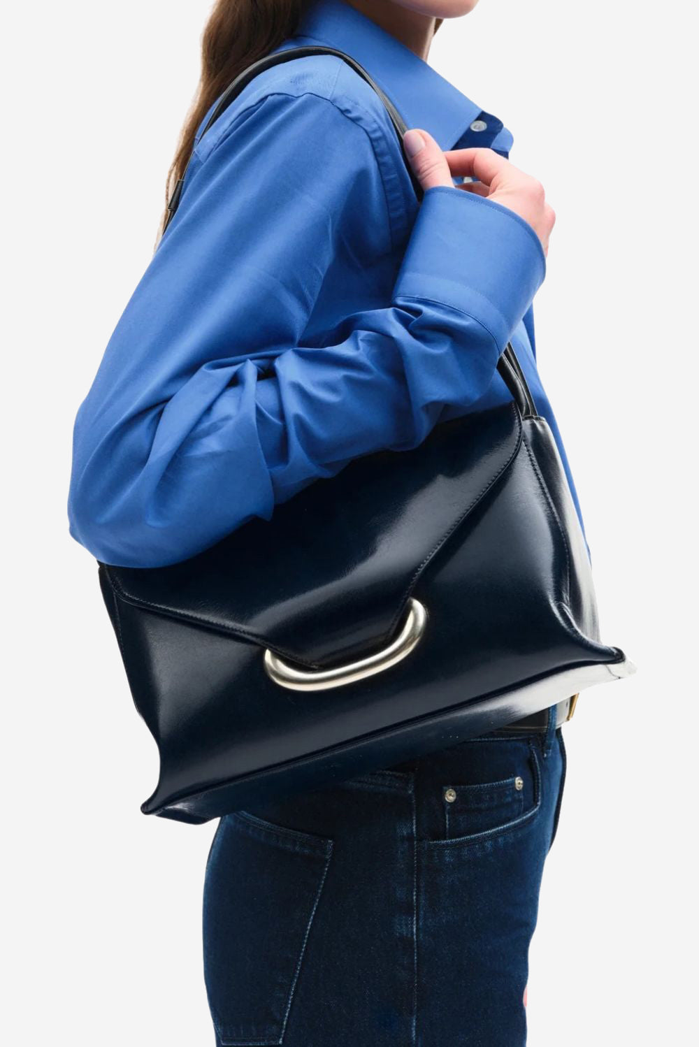 De handtas Veneto orion glaze van Wandler is een echte blikvanger. Het glanzende lakleer vangt het licht subtiel en laat de donkere kleur nog dieper lijken. De driehoekige flap geeft de tas een duidelijke vorm, terwijl de metalen handgreep in zilverkleur een fris accent toevoegt. De sluiting met magneet voelt stevig en soepel aan. Binnenin is genoeg ruimte voor de dagelijkse essentials, met een handig vak aan de achterkant voor kleine spullen. De tas is uitgevoerd als schoudermodel en valt elegant tegen het lichaam. Elke Wandler tas wordt in Italië met de hand gemaakt, waarbij het lakleer zorgvuldig wordt gepolijst tot een gladde, spiegelende finish. De Veneto laat goed zien waarom dit Nederlandse label geliefd is onder liefhebbers van mooi vakmanschap en sterke vormen.