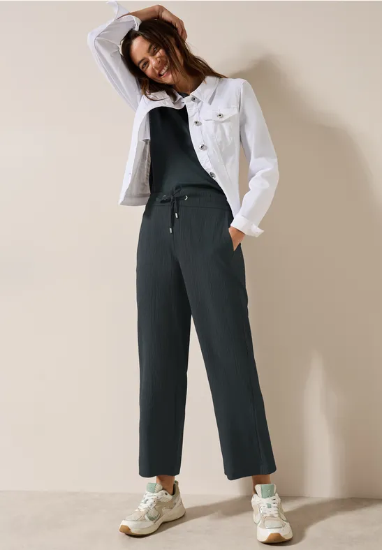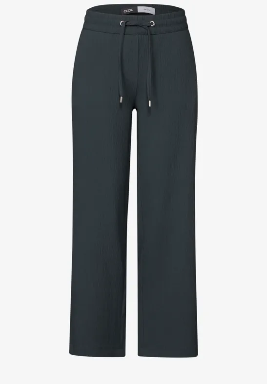 Deze gestructureerde broek in de stijl Neele van CECIL voor dames combineert modieuze Wide Legs met een fijne structuur. De High Waist maakt de look compleet, terwijl een Stretch tailleband met koord een sportief accent toevoegt en zorgt voor een hoog draagcomfort. De comfortabele pasvorm maakt deze damesbroek tot een ideale keuze voor je zomerse looks.