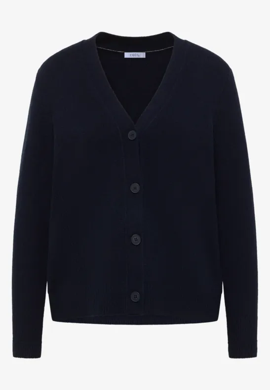 Dit damesvest van CECIL heeft een zachte katoenmix en een klassieke V-hals. De knoopsluiting en lange mouwen met manchetten geven het vest een tijdloze touch en maken het veelzijdig. Ideaal voor een ongecompliceerde, comfortabele alledaagse look.