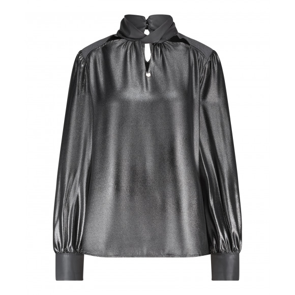 Blouse van het merk Zip73. Deze blouse is uitgevoerd in een glanzende, metallic grijze stof die een chique uitstraling geeft. Het model heeft lange mouwen met manchetknopen, een keyhole detail met knoopsluiting bij de hals en een elegante strikdetail aan de kraag.